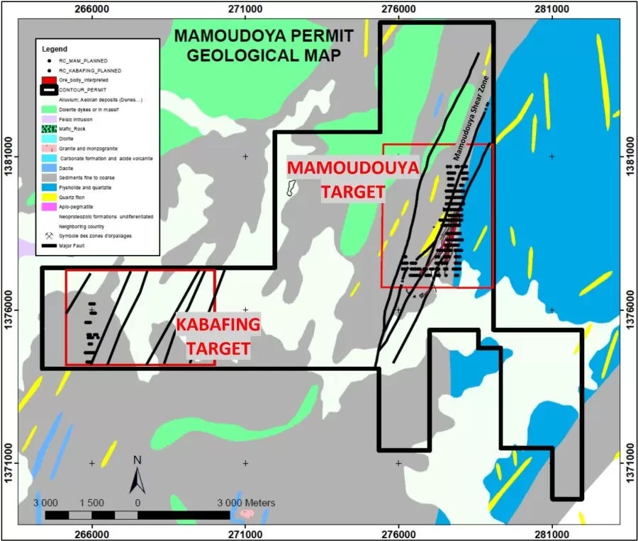 Detailed geological and structural interpretation of the first holes drilled at the Mamoudouya target combined with information from historical holes demonstrate that the gold is developed along an NNE-striking, steeply NW-dipping Mamoudouya Shear Zone (Figures 1 and 2) and is preferentially hosted in the more permeable, coarser-grained greywacke and in a lesser extend in the siltstone in the northern portion of the target. This Fault can be traced over 6 km within the permit and is located within the sedimentary sequence in the north and within a granite unit in the south. Gold occurs as dissemination into the Hangingwall strongly silicified and hydrothermally altered coarse-grained greywacke rocks and is associated with extensive quartz veining in form of breccia, veins and stockwork with pervasive disseminated of fine-grained pyrite, and arsenopyrite. Key alteration associated with the gold mineralization are silicification, calcite and chlorite. The higher-grade mineralization in the altered greywacke, is extensively mined by artisanal workers, with free gold recovered from the oxidized rock.